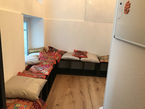 Wir haben die Winterpause, neben dem Praktizieren besinnlicher Meditationen und dem Feiern der Festtage, für eine Verschönerung unserer Yogaschule genutzt. Die Motivation für einen Umbau entwickelte sich bereits im letzten Jahr. Unsere Idee war genügend Platz für Eure Schuhe, Mäntel und Jacken zu schaffen und darüber hinaus noch einen schönen Bereich zur Zusammenkunft und Entspannung zur kreieren. Daraus hat sich nun eine komplette Veränderung des Küchenbereiches ergeben und die Gestaltung einer nützlichen Sitzbank mit vielen Kissen im indischen Stil. Auf dieser Sitzbank könnt ihr in gemütlicher Atmosphäre genüsslich einen Tee nehmen und Euch an unserer neuen Wasseranlage bedienen, die Euch unbegrenzt mit basischem Aktivwasser versorgt. (Zum Thema Wasser folgen in Kürze weitere Blogeinträge!) Natürlich könnt ihr Eure Trinkflaschen auch auffüllen, um für den Nachhauseweg hydriert zu bleiben. Wir freuen uns das neue Jahr mit dieser Veränderung zu eröffnen und hoffen Euch schon bald bei einem Wasser in unserer „Chilllounge“ anzutreffen.